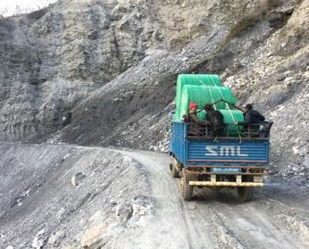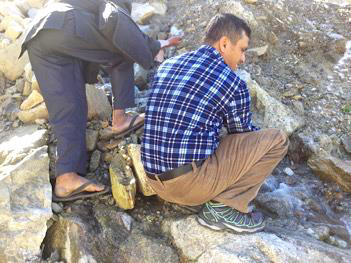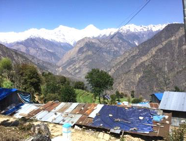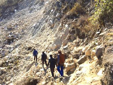 The avalanche swept away 2 of their villages - 100 families and animals; and their water supply. Crossing it is still dangerous - imperceptible mountain tremors surface, and suddenly a metre wide ‘river of small rock’ is running down through the avalanche. Stepping into it would be like ‘quick-sand’ taking anyone with it. A village Elder guides our team safely across the ½ mile collapse