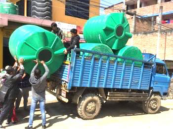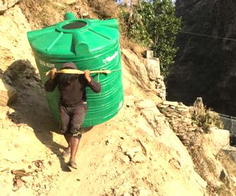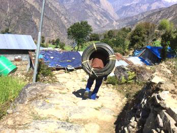 It’s 10 ft down under some ‘green vegetation’ discovered growing isolated, among the rubble of the earthquake. This is what we have learned to look for. It indicates a source of water nearby or underneath the green growth. Construction starts, laying the 3,000m pipe line to staged storage tanks, and finally to the green tanks that were carried in; finally supplying water to each family.