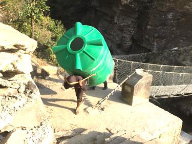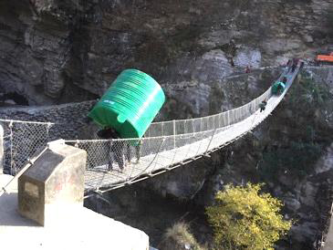 Everything must be carried up narrow mountain side tracks, across suspension bridge, and avalanches. Up and up and up!